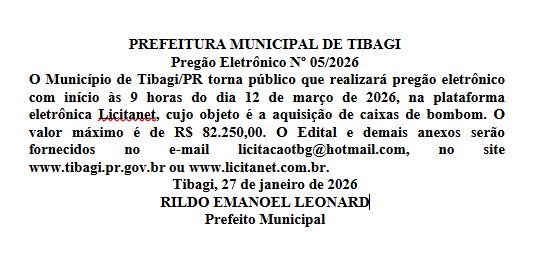 PUBLICAÇÃO LEGAL :PREFEITURA MUNICIPAL DE TIBAGI- PREGÃO ELETRÔNICO Nº 05/2026