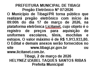 PUBLICAÇÃO LEGAL : PREFEITURA MUNICIPAL DE TIBAGI- PREGÃO ELETRÔNICO Nº 07/2026