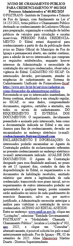 PUBLICAÇÃO LEGAL:FOZTRANS–AVISO DE CHAMAMENTO PÚBLICO PARA CREDENCIAMENTO Nº 002/2025-Processo Administrativo nº 60.882/2025