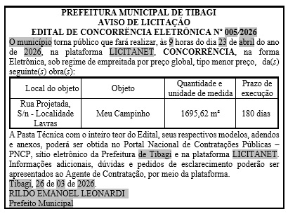 PUBLICAÇÃO LEGAL:PREFEITURA DO MUNICÍPIO DE TIBAGI- AVISO DE LICITAÇÃO – EDITAL DE CONCORRÊNCIA ELETRÔNICA Nº 005/2026