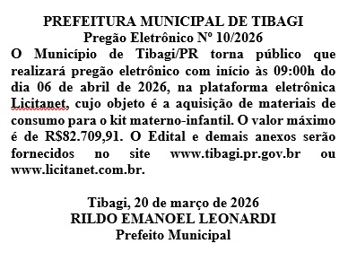 PUBLICAÇÃO LEGAL:PREFEITURA DO MUNICÍPIO DE TIBAGI- PREGÃO ELETRÔNICO Nº10/2026
