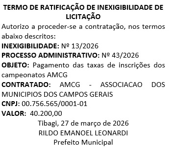 PUBLICAÇÃO LEGAL:PREFEITURA DO MUNICÍPIO DE TIBAGI- TERMO DE RATIFICAÇÃO DE INEXIGIBILIDADE DE LICITAÇÃO nº 13/2026