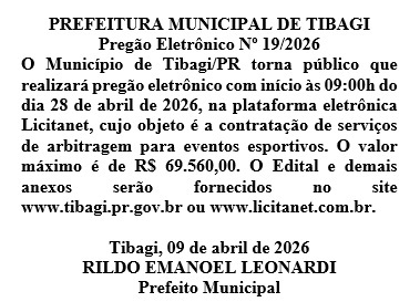 PUBLICAÇÃO LEGAL:PREFEITURA MUNICIPAL DE TIBAGI- PREGÃO ELETRÔNICO Nº 19/2026