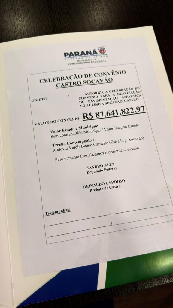 “Agora podemos dar início ao processo de licitação para asfaltar o trecho que ainda falta para pavimentar toda a Estrada do Socavão”. A afirmação é do prefeito de Castro, Reinaldo Cardoso, que nesta quinta-feira (18), assinou, junto do secretário de Estado de Infraestrutura e Logística, Sandro Alex, o convênio para a execução da obra na Rodovia Valdir Bueno Carneiro. São 8,4 quilômetros de via, com dois viadutos, prevendo investimentos de até R$ 87,6 milhões pelo Governo Estadual.