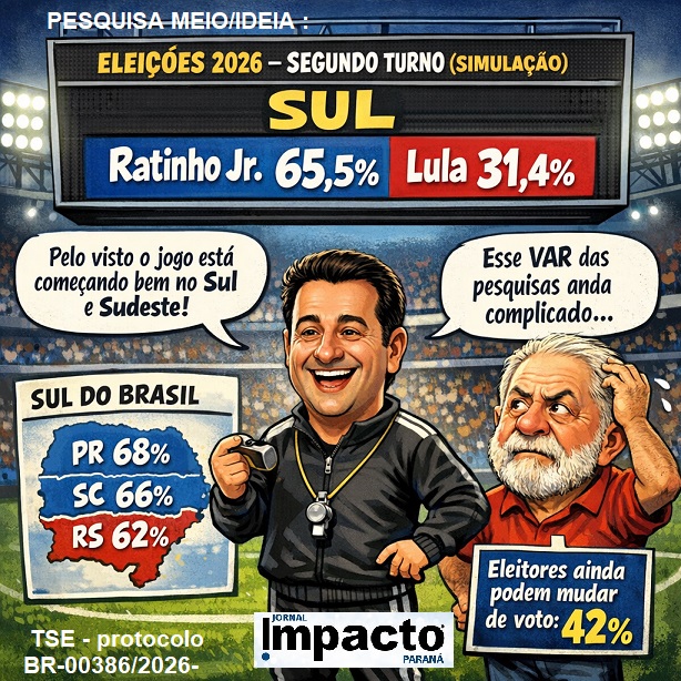 O governador Ratinho Junior (PSD) tem uma vantagem cada vez mais consolidada contra Lula (PT) nas regiões Sul e Sudeste em um eventual segundo turno em 2026. A pesquisa Meio/Ideia divulgada nesta quarta-feira (11) mostra que ele bate o atual presidente com 65,5% x 31,4% no Sul e 49,9% x 43,4% no Sudeste, região mais populosa do Brasil.