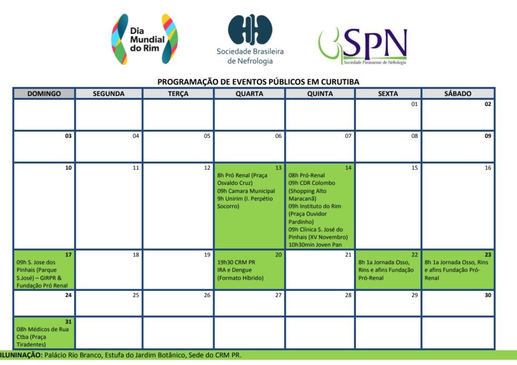 O Dia Mundial do Rim ocorrerá no dia 14 de março de 2024 e várias ações estão programadas para abranger e alcançar o maior número de pessoas, desde governantes, legisladores, educadores, profissionais de saúde e, principalmente, a população em geral.