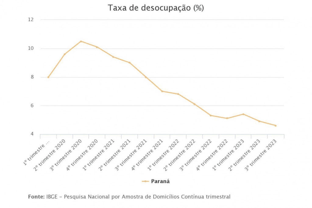 Com uma nova redução na taxa de desocupação, que chegou a 4,6% no terceiro trimestre de 2023, o Paraná atingiu o menor índice de desemprego dos últimos nove anos. A taxa recuou 0,3 ponto percentual em relação ao trimestre anterior (4,9%) e 0,7 ponto percentual ante o terceiro trimestre do ano passado (5,3%). É a terceira queda seguida de 2023, como mostra a Pesquisa Nacional por Amostra de Domicílios Contínua (PNAD Contínua), divulgada nesta quarta-feira (22) pelo Instituto Brasileiro de Geografia e Estatística (IBGE).