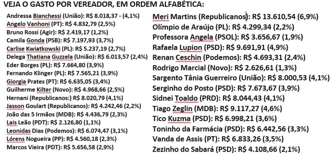 Até o mês dez o legislativo municipal gastou R$ 196.132,22 em combustível para os mandatos. Não utilizam o carro oficial os vereadores: Beto Moraes (PSD), Bruno Secco (Republicanos), Indiara Barbosa (Novo), João Bettega (União), Nori Seto (PP) e Pier Petruziello (PP). Os dados foram confirmados pela comunicação da Câmara de Curitiba.